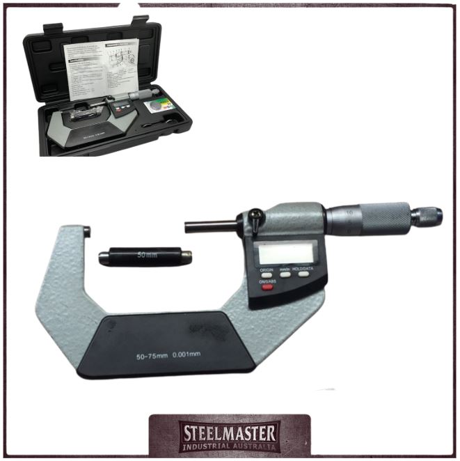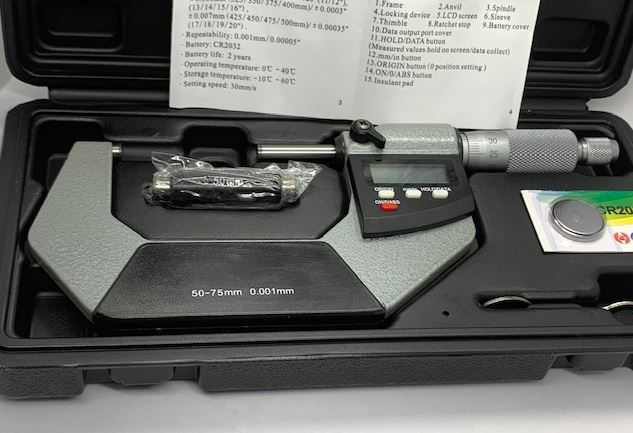 Dual reading Electronic Digital Outside Micrometer accurately measures outside dimensions between 50 and 75mm with graduations of 0.0005″ / 0.0127mm.
