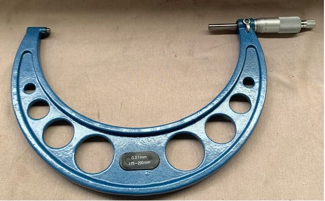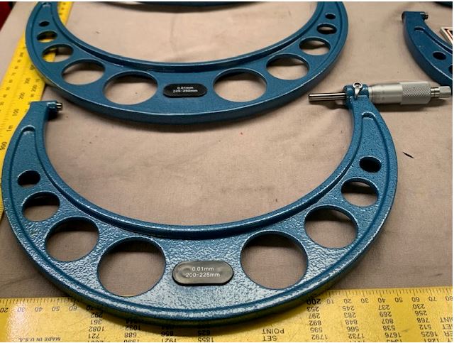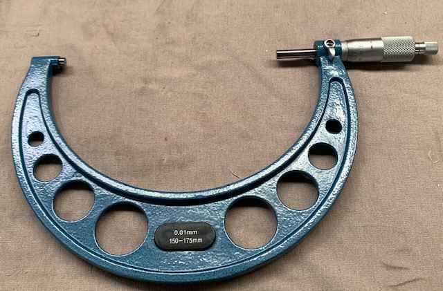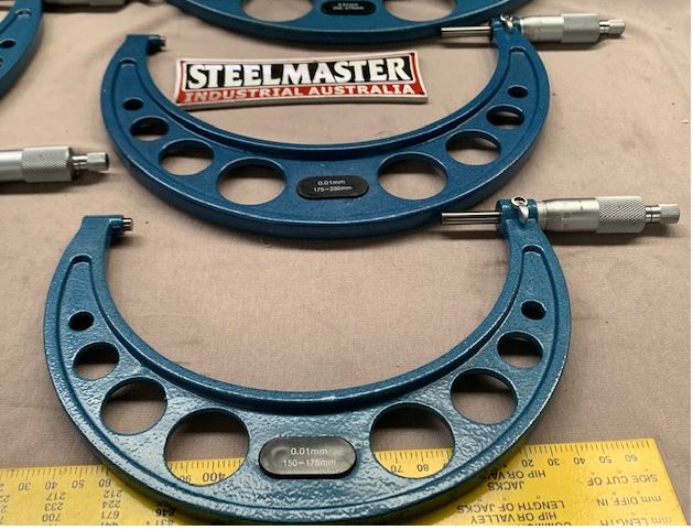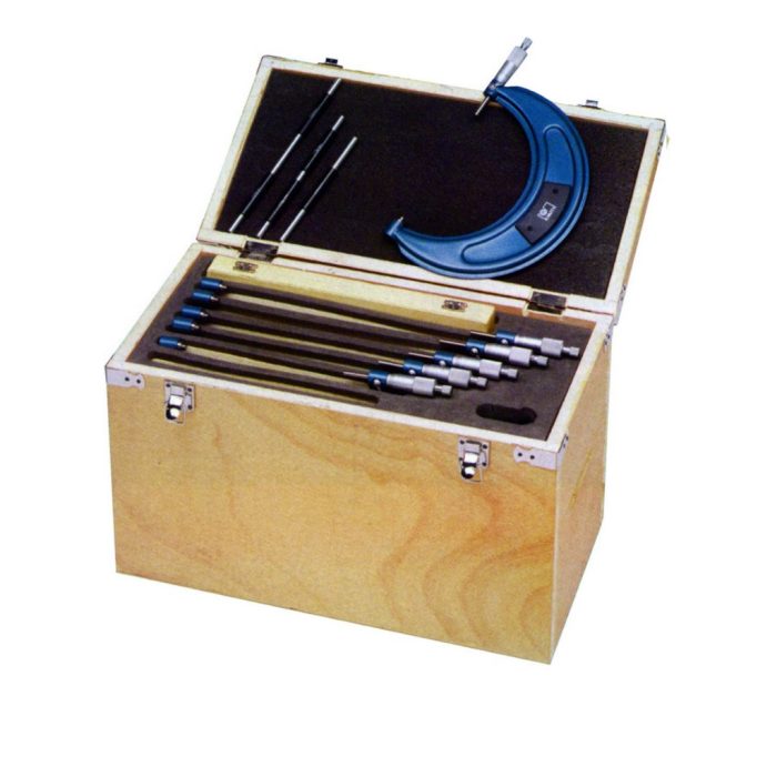 Precision made micrometers feature ratchet stop adjustment, carbide tips, locking lever and smooth enamel. Sets include standards, wrench and wooden case. Reads in .01mm increments. Type: 150 – 300mm